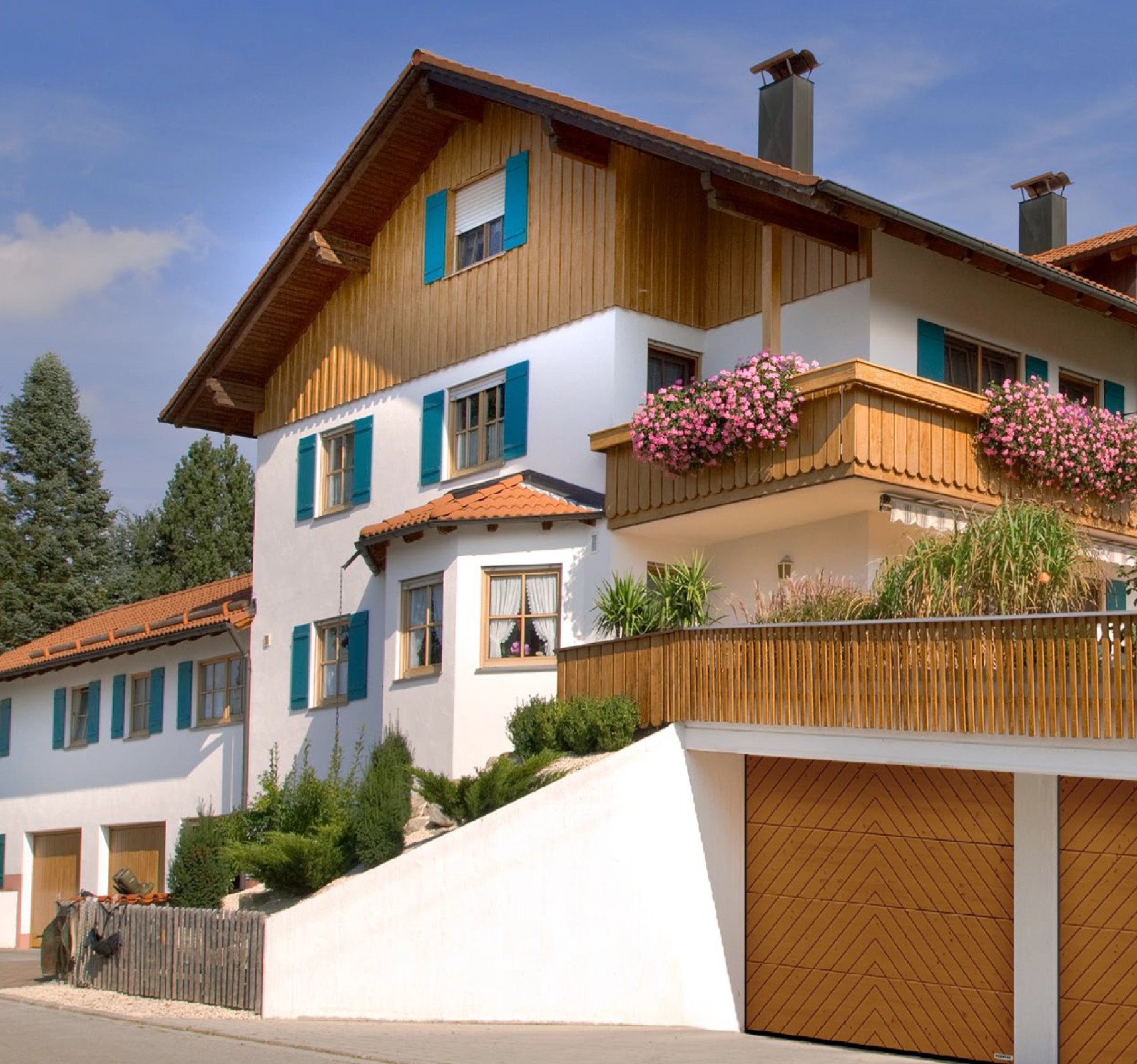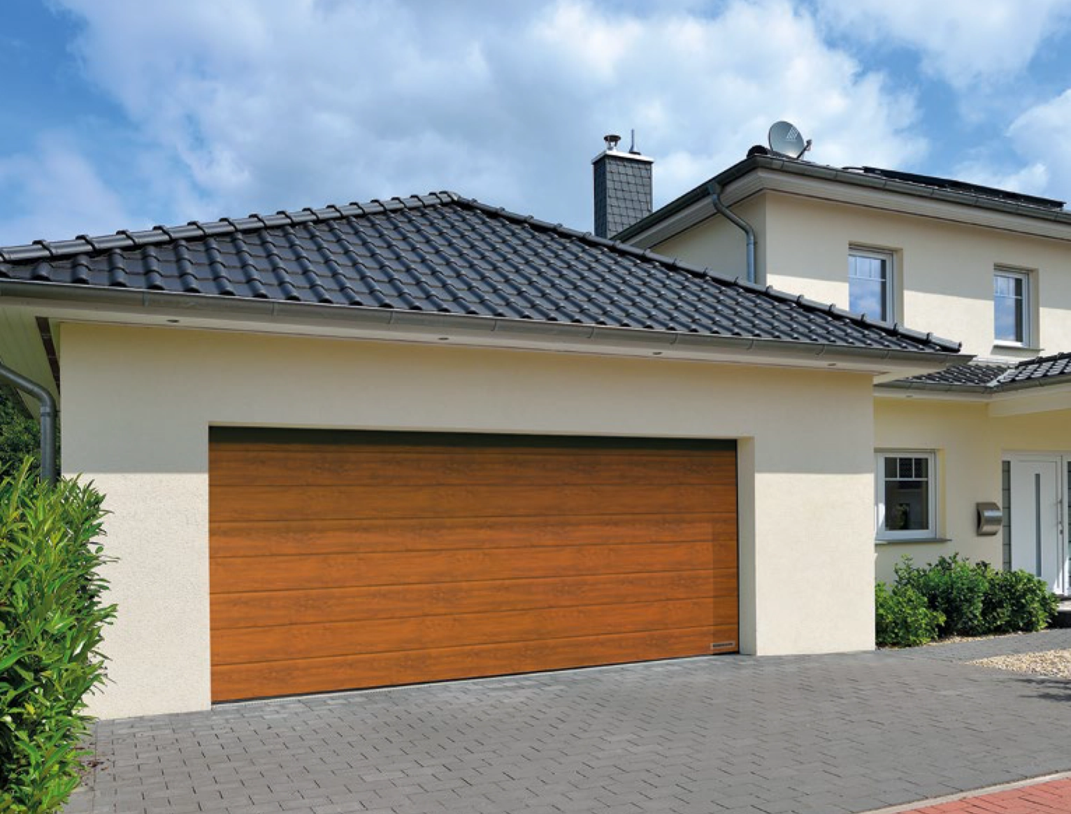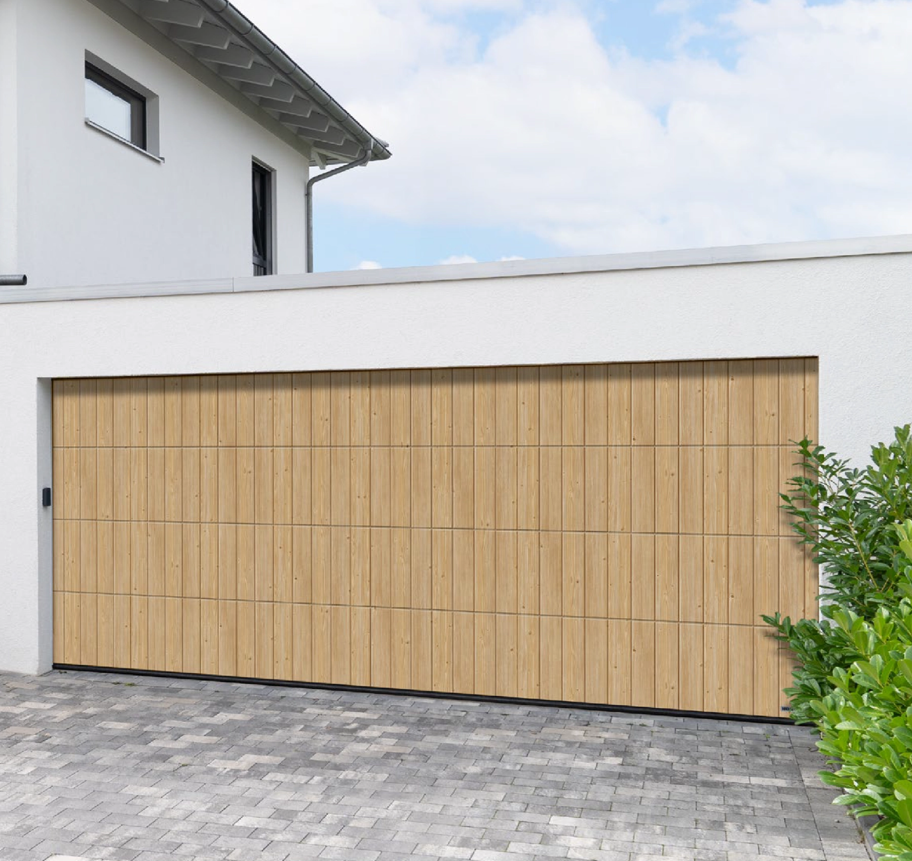 Hier sollte das Tor die moderne, helle Architektur ergänzen – ohne aufdringlich zu wirken. Die Holzoptik sorgt für Wärme im Look, während die Umsetzung auf präzise Montage und einen zuverlässigen Torlauf ausgelegt ist.
